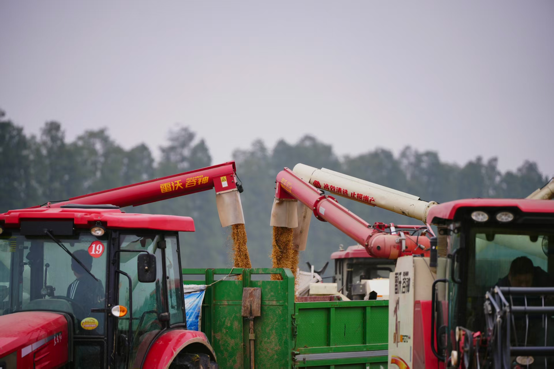 随着一声令下,20多台联合收割机浩浩荡荡驶向田间,金色的稻穗在机器的吞吐间化作饱满的谷粒,被源源不断地输送到运粮车上。