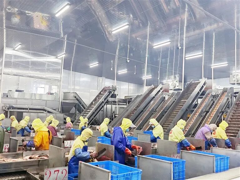 近日,位于张金镇的湖北潜投科技有限公司鱼糜生产车间内,工人们正紧张有序地在流水线上作业,现场一派繁忙景象。据该公司负责人介绍,该项目总投资2.5亿元,建筑面积约7万平方米,项目分两期建设。其中,一期鱼糜生产线前不久已进入试生产阶段,二期小龙虾生产线以及立体智能化冷库项目正加紧施工,力争明年4月全部建成投产。 (记者 余晓勤 见习记者 彭郭 摄)