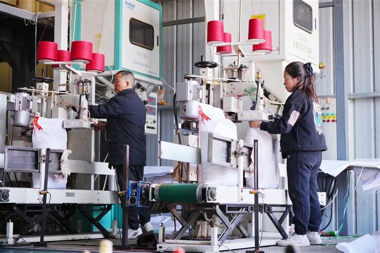 与此同时,湖北运储农贸发展有限公司产销繁忙,生产车间里机器轰鸣,工人分工协作加工大米,线上直播间同步发力。该公司自2013年推行“公司+基地+合作社+农户”模式,在运粮湖管理区及周边打造3.4万余亩种植基地,通过线上平台及线下渠道年销稻米700余吨,有效带动当地农户增收。(记者 关洪磊 摄)