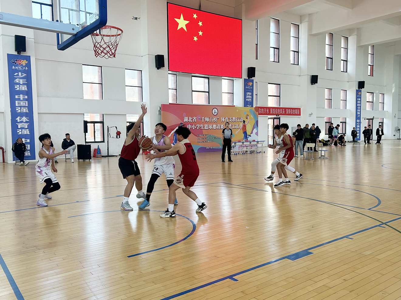 潜江新闻网讯(潜江市融媒体中心记者 王宇杰)12月6日,曹禺中学泰丰校区体育馆内气氛火热,呐喊声、助威声不绝于耳。2025年湖北省“千师百校”体育支教行动中小学生篮球邀请赛(潜江站)在此激情开赛,来自全市各中小学的8支初中组、6支小学组队伍,共计300余名篮球小将齐聚一堂,在三人制篮球的赛场上展开激烈角逐与友好交流。