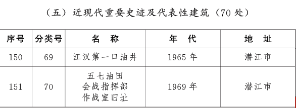 2025年12月22日湖北省人民政府发布《关于公布第九批湖北省文物保护单位的通知》,我市江汉第一口油井、五七油田会战指挥部作战室旧址等2处文物保护单位成功入选。
