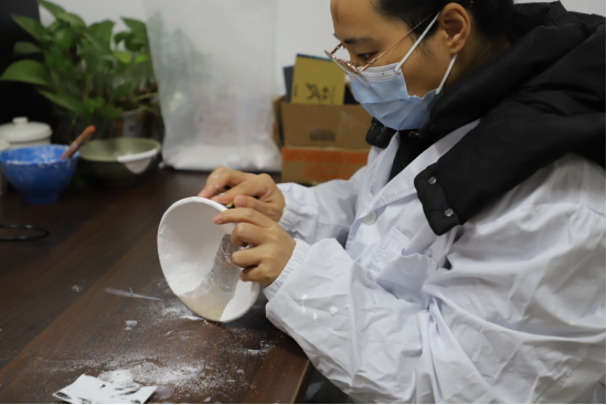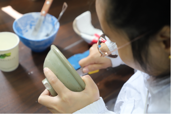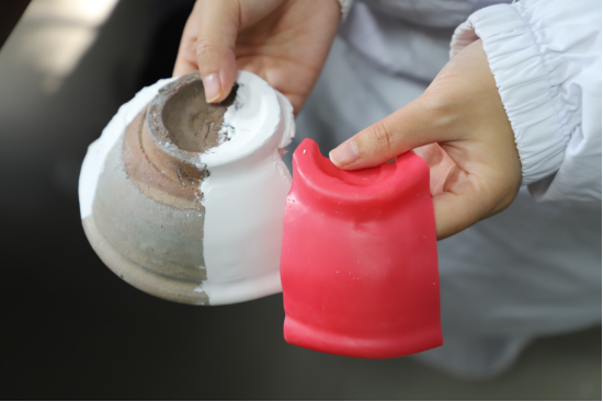 “文物残片刚从遗址采集回来时,大多覆满泥土,清理、阴干后才能进入拼接补配环节。”工作人员董慧琳介绍。红蜡片覆在陶片外侧,电吹风加热,蜡片软化,指尖按压,蜡片贴合陶片弧度,这一步叫“塑补”。石膏填入蜡模,凝固后,小刀塑形,砂纸打磨。一片又一片,碗的形态逐渐完整。“这项工作需要极大的细心与耐心。修复一个普通的陶瓷碗需要一两天的时间,复杂的甚至数天。”董慧琳告诉记者。