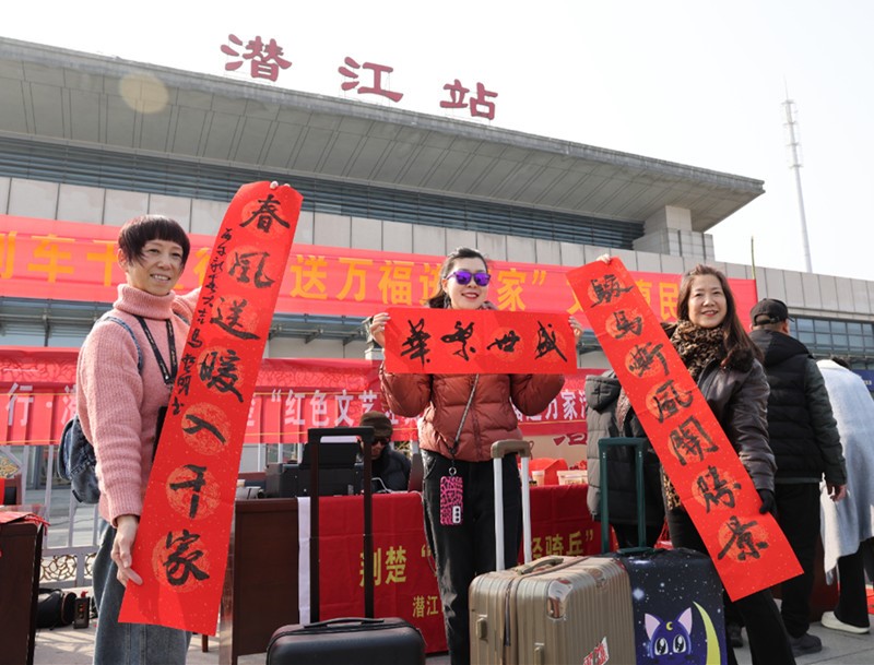 2月2日春运首日,潜江火车站墨香四溢,市文联荆楚“红色文艺轻骑兵”在此启动“送万福进万家”活动。6位市书协会员现场挥毫,为返乡、出行旅客义务书写春联和福字,笔墨间饱含新春期许,让站前广场年味十足。