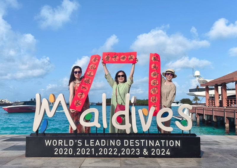 从潜江出发,刘女士一行首先抵达上海虹桥机场。她们特意展开春联合影,红底黑字的春联与现代化空港相映成趣,为旅途增添了别样仪式感。随后,这份承载潜江温度的“中国红”远渡重洋,最终抵达马尔代夫。