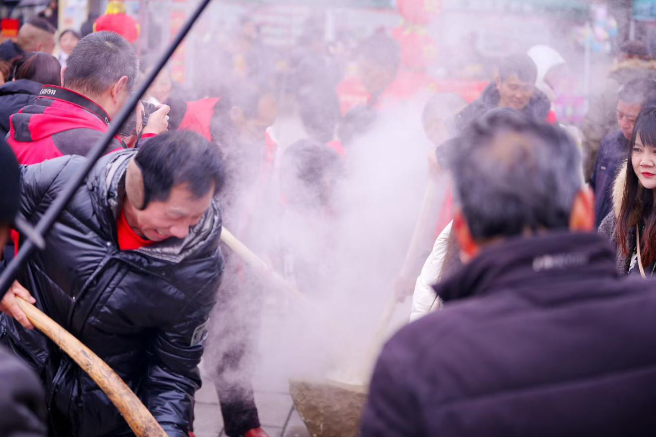 美食摊位前暖意升腾,油锅里滋滋作响,金黄的炸鱼、圆润的肉丸翻滚浮沉,出锅不久便被抢购一空;摊豆饼的鏊子上热气升腾,一张张焦香酥脆的豆饼被迅速分切,咬下去的“咔嚓”声里全是满足。最热闹的当属打糍粑,“砰、砰、砰”的捶打声坚实有力,糯米在木槌下逐渐绵软柔韧。不少市民挽起袖子,亲自上阵,虽动作略显生疏,但脸上却洋溢着开心的笑容。