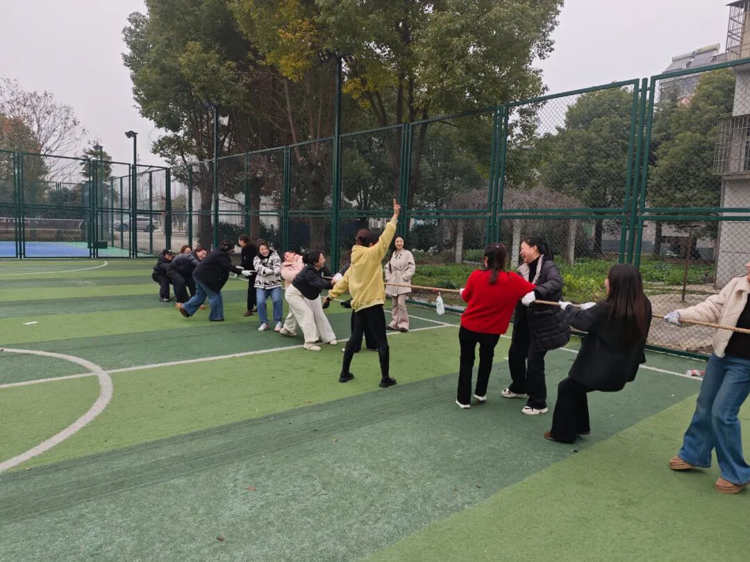 热身环节结束后,各类趣味团队拓展项目轮番上阵,内容丰富、趣味性十足。破冰环节快速打破岗位隔阂,大家现场组建4支特色队伍,创意设计队旗、喊出激昂口号,迅速凝聚团队向心力;“无敌风火轮”“一圈到底”等项目中,队员们步调一致、默契配合,在协作中感受团队力量;拔河比赛更是将活动氛围推向顶点,参赛队员紧握绳索、奋力拼搏,啦啦队呐喊助威、声势震天,充分展现了巾帼不让须眉的担当。