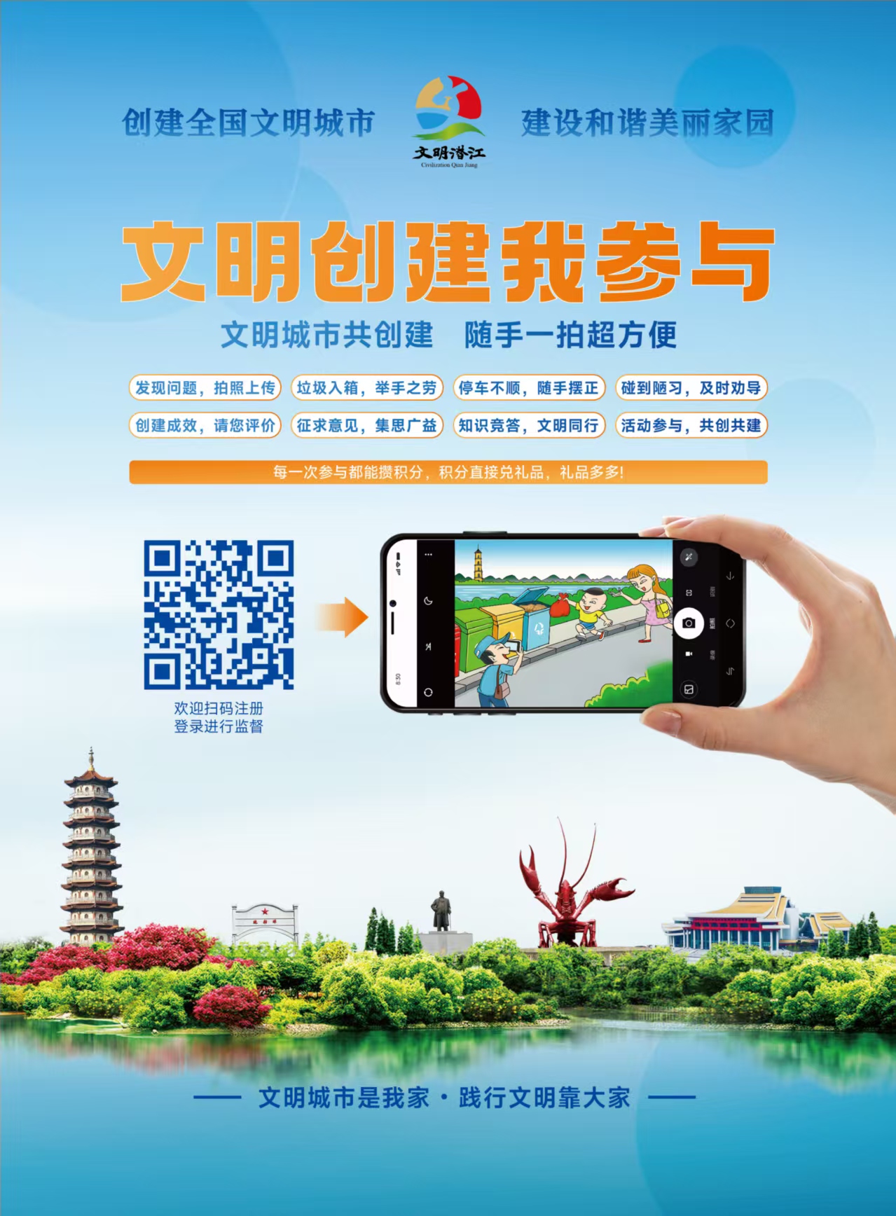 市民可以以两种方式快速进入系统:关注“文明潜江”微信公众号,点底部“文明积分”菜单就能注册;直接扫码宣传海报上的二维码,或者专属推广码,登录后收藏页面,下次打开就能一键进入。平台里藏着六大实用功能,不管是哪种创文场景都能覆盖到:路上看到市容环境差、市政设施坏了,或是有安全隐患这类不文明问题,随手拍张照上报,审核过了就有积分;主动捡垃圾、维护公共卫生,或是劝导不文明行为,上传处置前后的对比图,能拿到更高积分;平时转发创文动态、答文明知识问卷,甚至扫码给身边的创建点位打分,这些行为都能攒下积分。