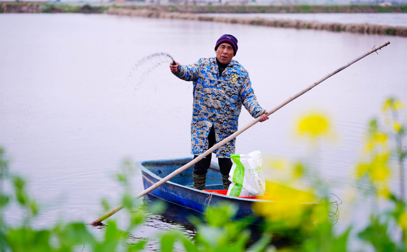 走进红旗社区戴湖三队的虾稻田,金黄的油菜花倒映在澄澈的水田中,波光粼粼间,春意扑面而来。养殖户郑元义轻划小船,熟练地向水面撒下饲料,船桨划过,搅碎了水中的花影,漾开一圈圈带着生机的涟漪。