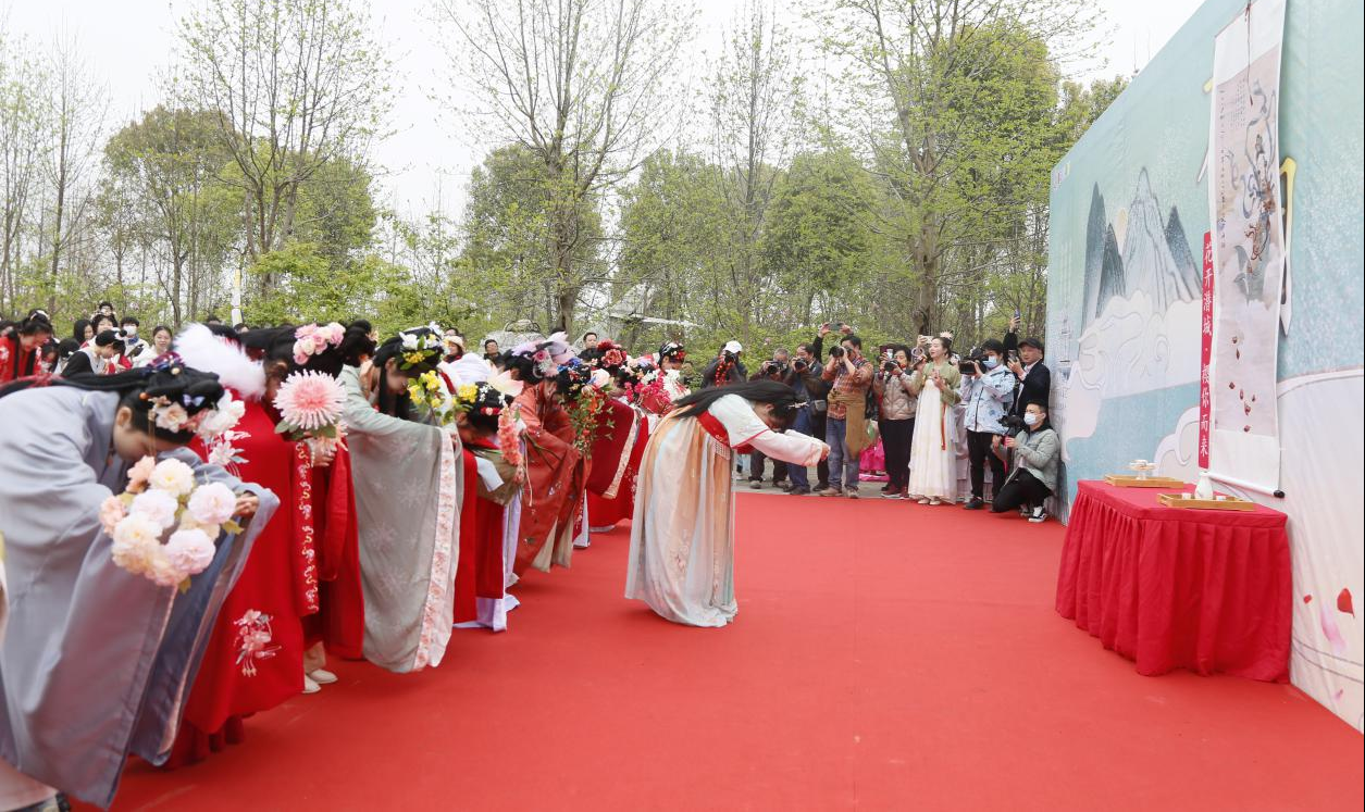 食花糕、品春茶、拜花神……来自江汉艺术职业学院汉服社的社员身着华服穿行花丛间,享受春日气息。舞台中央,舞蹈《百花争艳》、箫曲《卷珠帘》、国仪《旗袍盛宴》等,无不让人眼前一亮。