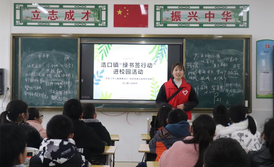 3月25日,浩口镇新时代文明实践所志愿服务队的志愿者们走进浩口三小,举行了一次“扫黄打非”主题的“绿书签”活动。