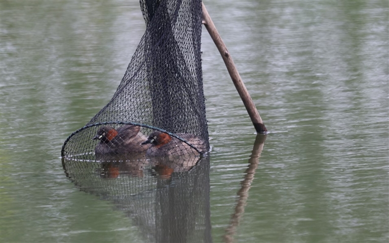 此时,在旁边安装电线的郭红斌告诉刘光军,大概一周前,一只小䴙䴘因觅食误入虾网内,没过几天,另一只小䴙䴘也进入了虾网。“其实我早有救助之意,但是因为没有雨裤,水温又太低,想到网内应该不缺食物,看到小䴙䴘潜水自如,也就这样观察等待着。”