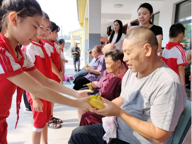 老人们身侧还有一群面带纯真笑容的孩子。他们的到来,给平日清静的福利院带来了阵阵欢笑声。孩子们围在爷爷奶奶身边争着捶背、洗脚,与爷爷奶奶说悄悄话,为爷爷奶奶表演歌舞、小提琴演奏等精彩的文艺节目,并送上水果等慰问品和节日祝福。稚嫩的祝福声让老人们的感动溢于言表,整个福利院洋溢着温馨、祥和的欢乐气氛。