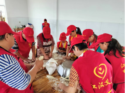 在福利院食堂里,几名志愿者将早已准备好的面粉、馅料、擀面杖等包饺子的食材和工具摆放在桌子上,大家分工合作,和面、擀皮、拌馅、包饺子。不一会儿,包好的饺子便摆满了桌面。