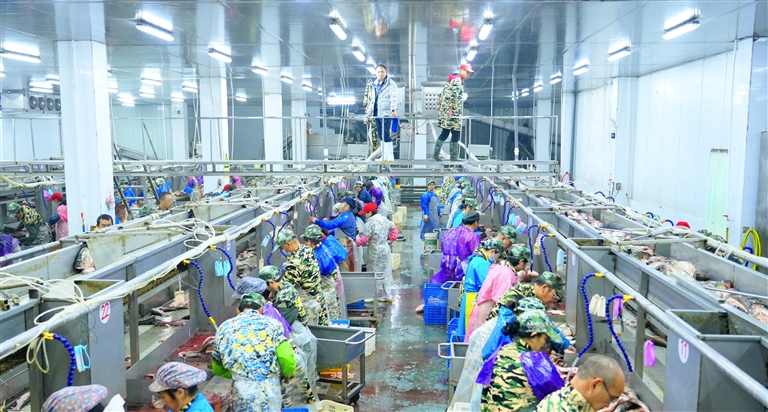 潜江新闻网讯(潜江市融媒体中心记者 关洪磊)11月6日,潜江昌贵水产食品有限公司杀鱼车间内,工人们身着洁净工装,在流水线上有序开展去鳞、剖洗、切片、速冻等作业。该公司每年9月至次年3月为生产旺季,当前生产线满负荷运转,日处理鲜鱼达200吨,年收益约2亿元。