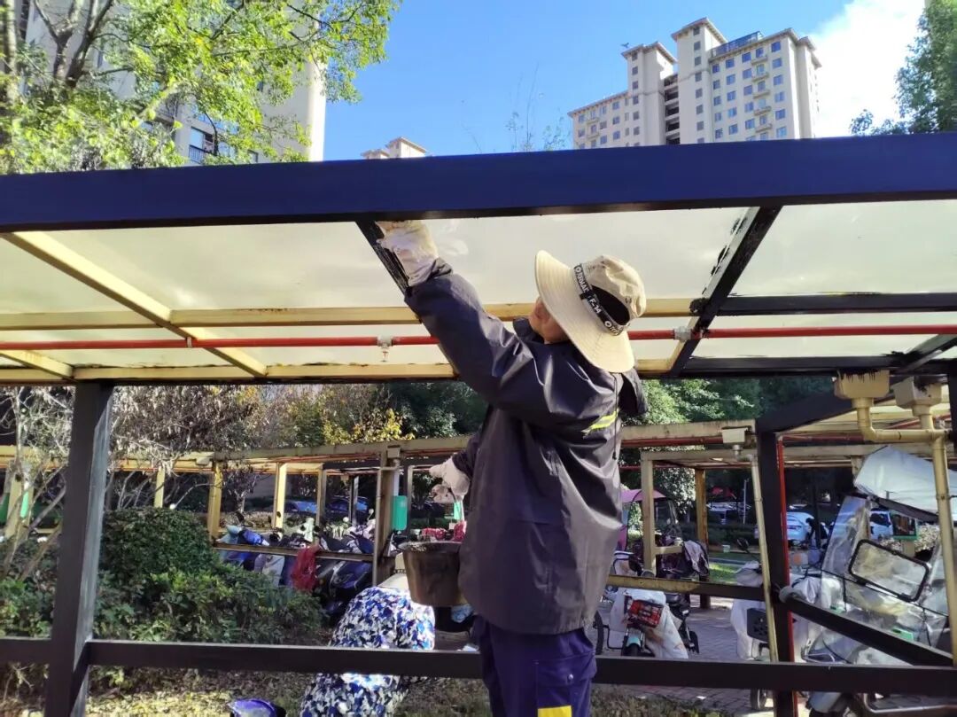 行动中,物业企业主动扛起主体责任,组织专业力量对车棚进行“全身体检”,通过人工打磨、机械除锈等方式彻底清除表面锈迹,并选用高品质防腐漆进行标准化涂刷,从源头上杜绝了结构安全隐患。经过集中整治,原本斑驳破旧的车棚焕然一新,不仅消除了悬在居民头顶的安全隐患,更让小区公共环境得到了显著改善,获得了居民的一致点赞。
