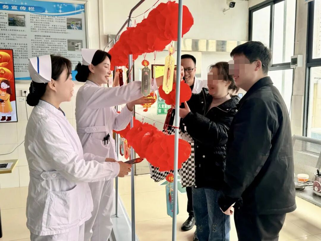 “顶上红冠戴,身披五彩衣,能测天亮时,呼得众人醒。”“一个娃娃小不点,一件红袄身上穿……”活动现场,一串串灯笼下悬挂的谜语引得众人驻足凝思。病友们或独自斟酌,或相互小声讨论,猜到答案便兴奋地举手示意。医护人员也参与其中,为大家揭晓谜底,掌声与欢笑声在病房走廊里回荡,瞬间让这里充满了节日的生机,不仅活跃了大家的思维,更拉近了医患之间心与心的距离。