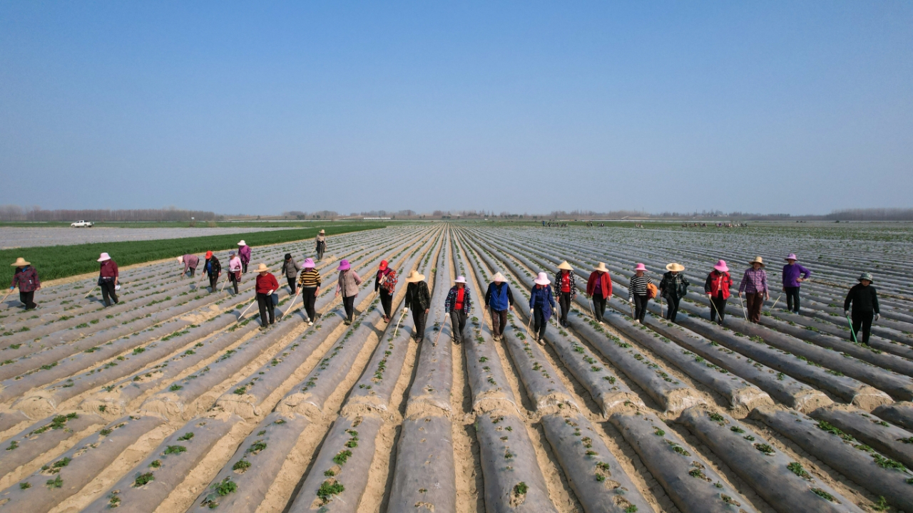 在现场,多的是像陈凤平这样经验老到的“土专家”,镇劳务队的队员皆是跟土地打了半辈子交道的“老把式”。田间地头也还活跃着许多“新农人”,返乡青年张伟正驾驶着一台小型勾膜机,沿着笔直的田垄快速推进,机器过处,原本有些松弛的地膜被重新压实。“以前全靠人力,一天下来累得腰都直不起来,还干不了多少活。现在机械开道,我们负责查漏补缺,效率翻了好几倍。”张伟脸上洋溢着对发展现代农业的信心。