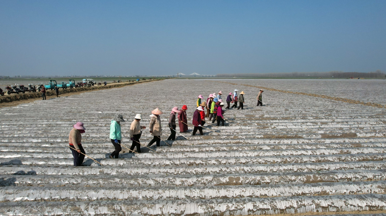 潜江新闻网讯(潜江市融媒体中心记者 周莹)惊蛰已过,春雷始鸣。眼下正值春耕备耕的关键时期,近日,走进竹根滩镇外滩,站在田埂上极目远眺,竹兴种植专业合作社(下文简称竹兴合作社)的万亩马铃薯基地仿佛一片银色的海洋。伴随着旋耕机的轰鸣声,近百名镇劳务队队员正俯身在地膜上仔细压实边角,阳光洒在锃亮的地膜上,折射出耀眼的光芒,勾勒出一幅“铁牛欢歌、银膜覆垄”的壮美春耕图。
