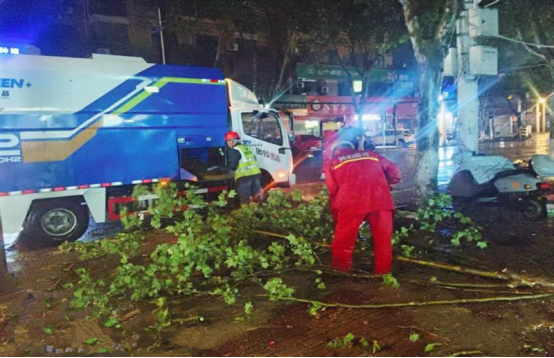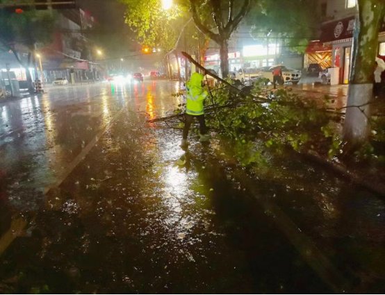 雨夜中,应急抢险队伍顶风冒雨、分兵多路,对城区主次干道、背街小巷及重点区域开展拉网式排查,精准处置各类险情。针对倒伏树木、悬空断枝等突出问题,采取“机械切割+人工清运”协同作业模式,同步规范设置警示标识,兼顾作业安全与通行秩序,全力加快清障进度。全体抢险人员通宵达旦、连续奋战,高效推进应急处置各项工作。