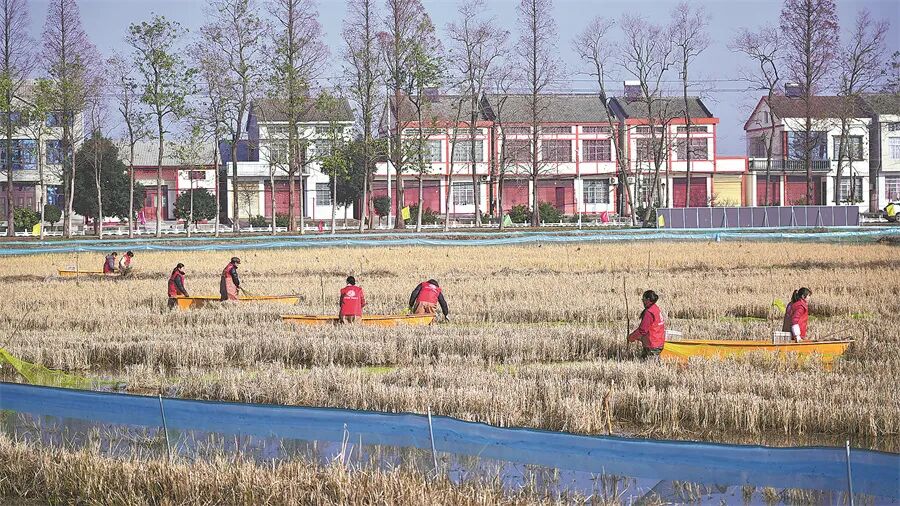 Farmers in Qianjiang harvest crayfish in winter in a paddy field.
