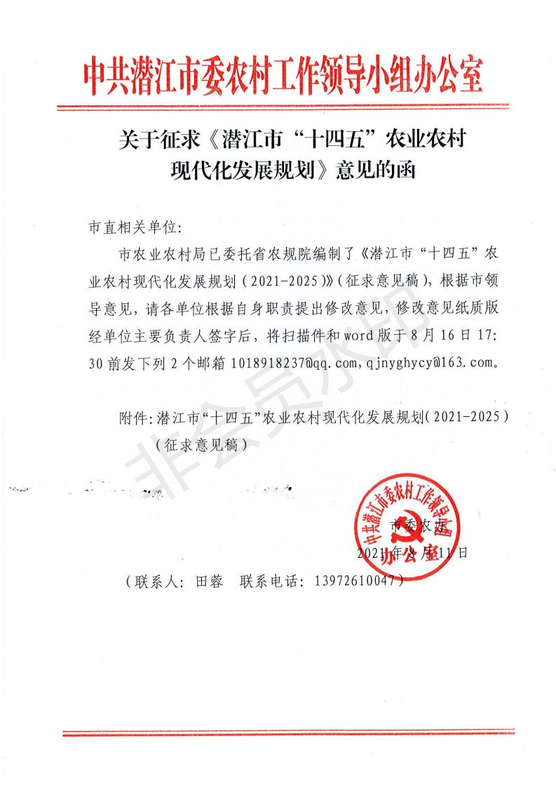 关于征求《潜江市“十四五”农业农村现代化发展规划》意见的函