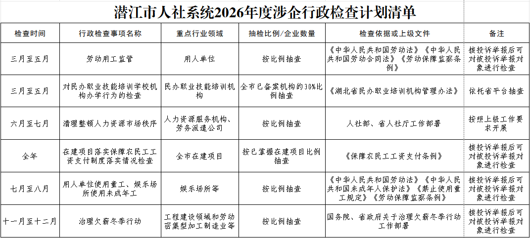潜江市人社系统2026年度涉企行政检查计划清单