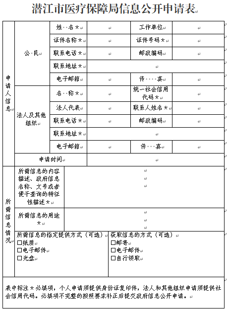 申请人可向本机关申请领取或自行复制《潜江市医疗保障局信息公开申请表》(见附件),也可在潜江市医疗保障局门户网站下载该表电子版本。