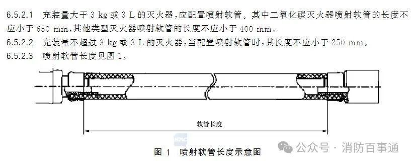 新标准在旧标准的基础上再规定不大于3kg或3L的灭火器如果配备配喷管的话其长度不应小于250mm。新标准还规定二氧化碳灭火器喷射软管长度不应小于650mm。