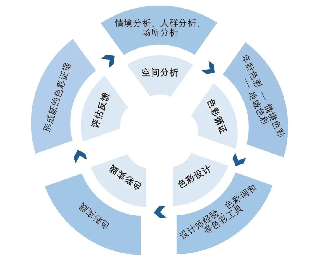 通过系统的色彩调查,综合考虑儿童的需求、特征和地域文化的特点,构建空间色彩集合。引入视觉感知量表、情绪反应量表,结合生理表征研究工具,为开展在地化色彩环境设计提供科学证据。在循证研究基础上,进一步运用色彩对比、色彩调和、色彩形象坐标等色彩搭配理论,并结合实践经验,制定科学的色彩设计方案。为了持续推进儿童友好色彩环境的品质,实践中还应建立评估和反馈机制来检验设计的有效性,检验儿童群体的满意度和城市整体色彩环境的发展,形成实践闭环(图6)。