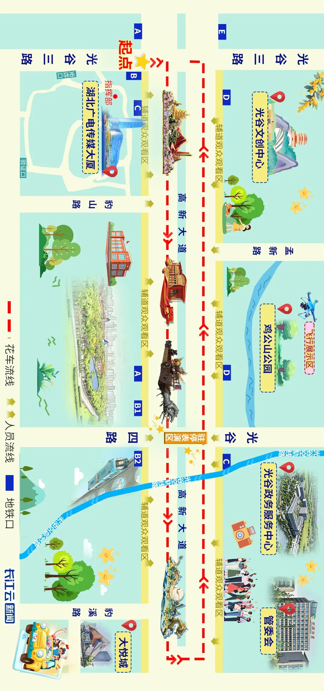 高新大道(光谷三路至武汉大悦城)沿街全是黄金位,图中已重点标注。该区域视野开阔,可清晰观赏花车全貌,无需拥挤。