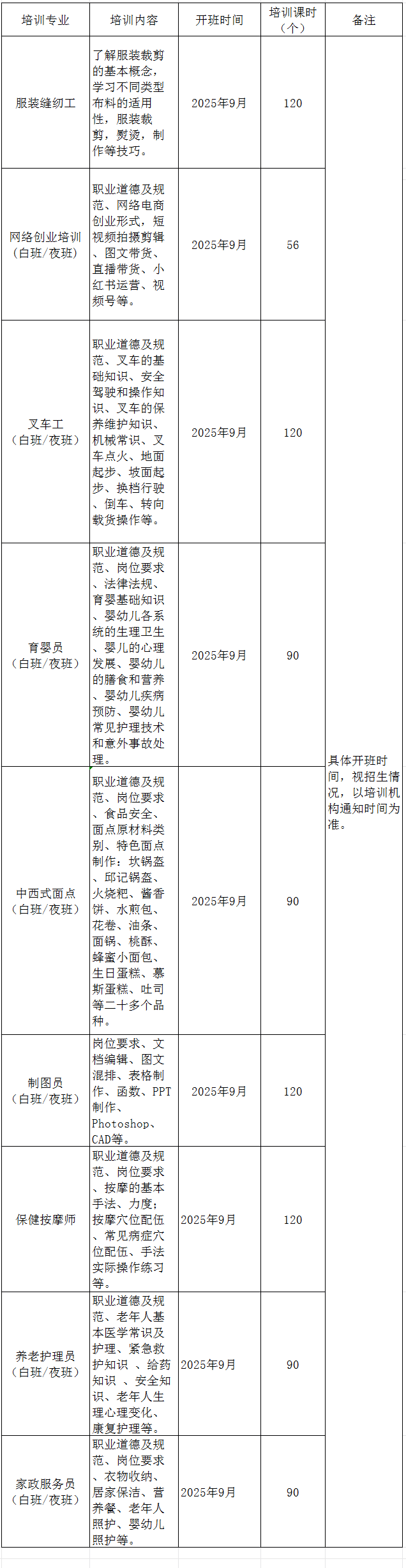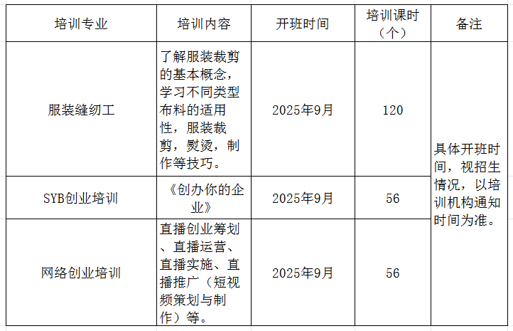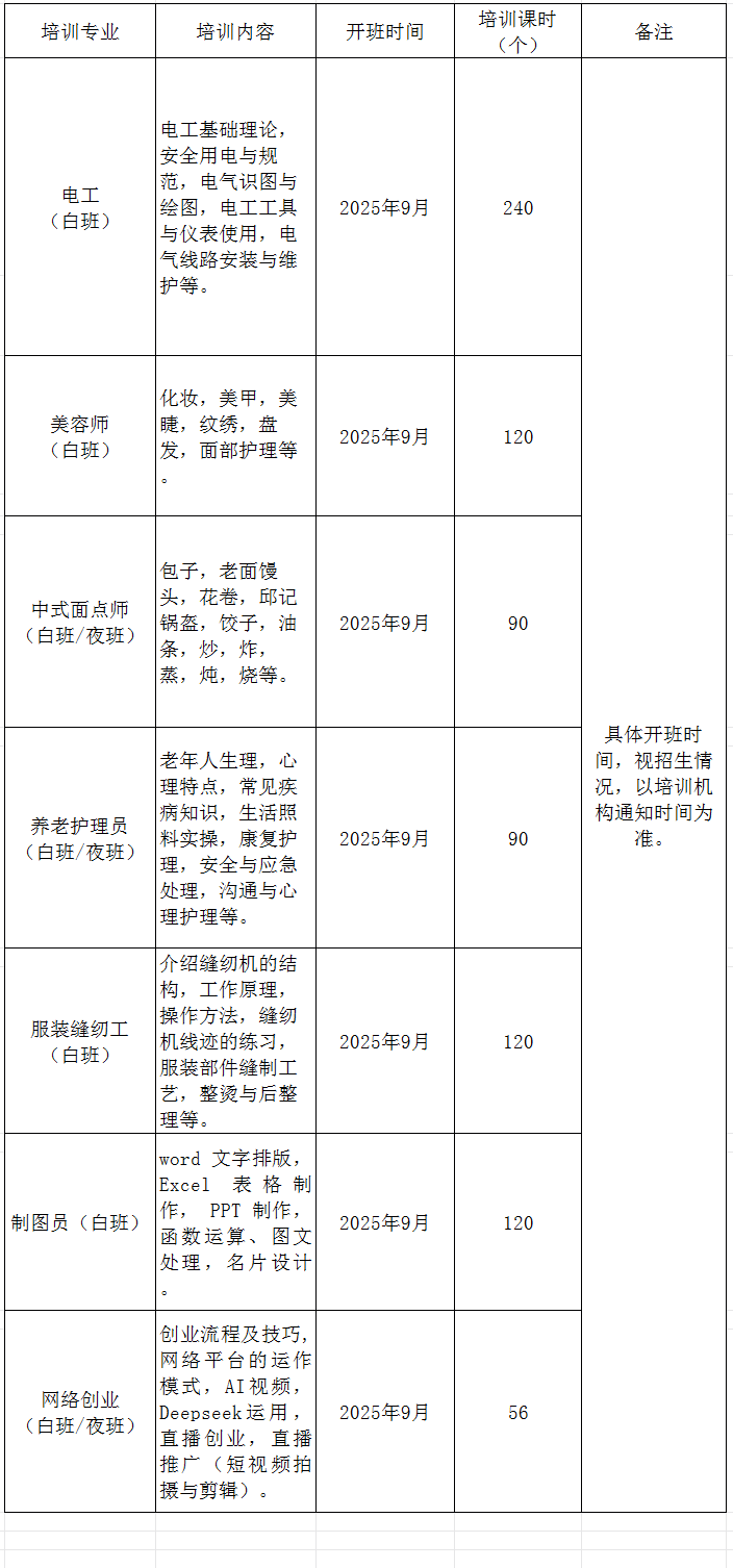 为深入贯彻落实“技能照亮前程”培训行动,提升城乡劳动者就业技能,促进高质量就业,现将潜江市2025年9月份补贴性就业创业培训开班信息予以公布。培训专业主要有叉车工、电工、制图员、育婴员、美容师、服装缝纫工、养老护理员、中西式面点、网络创业培训等,请符合培训条件以及有培训愿望的城乡劳动者踊跃报名参加。