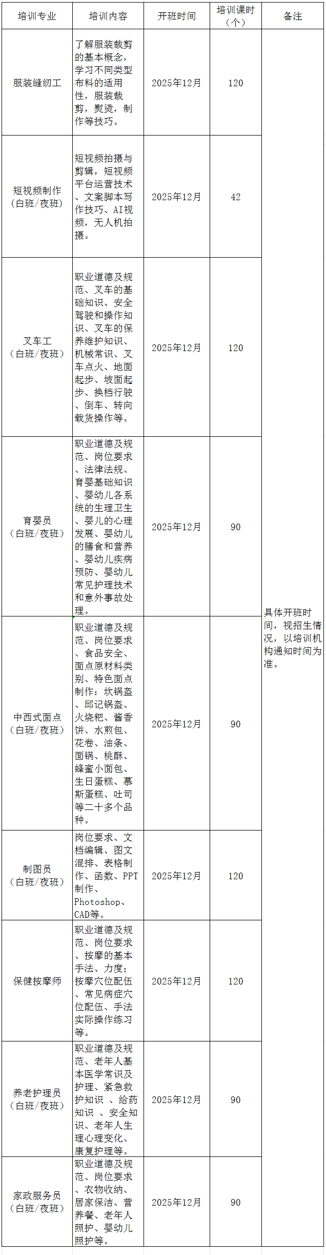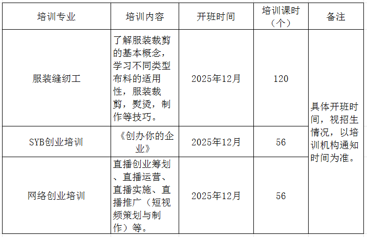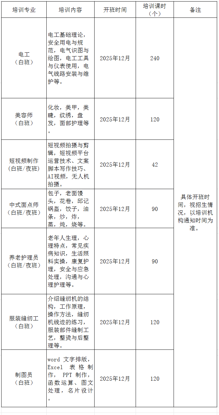 为深入贯彻落实“技能照亮前程”培训行动,提升城乡劳动者就业技能,促进高质量就业,现将潜江市2025年12月份补贴性就业创业培训开班信息予以公布。培训专业主要有叉车工、电工、制图员、育婴员、美容师、服装缝纫工、养老护理员、中西式面点、网络创业培训等,请符合培训条件、以及有培训愿望的城乡劳动者踊跃报名参加。