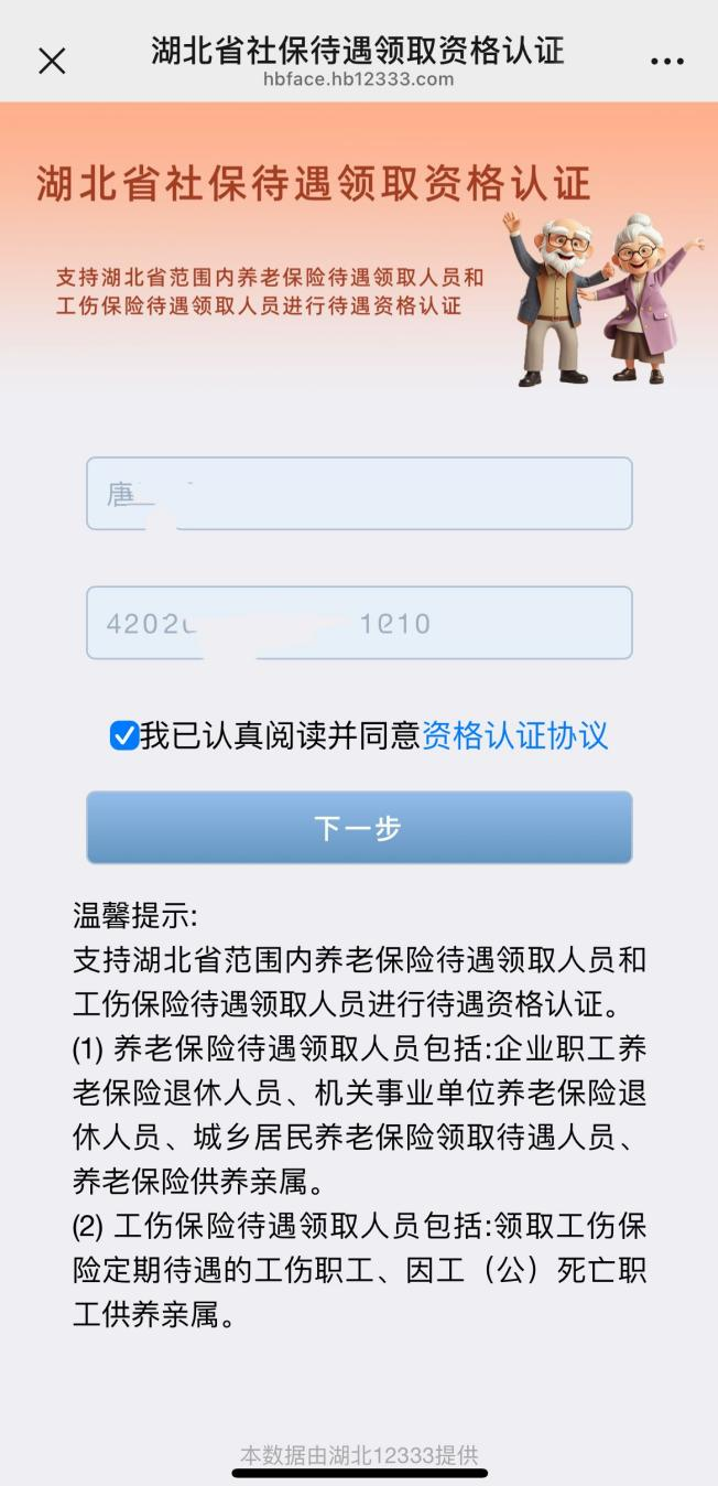 1.扫描上方二维码后,跳转进入湖北省社保待遇领取认证界面填入“姓名”、“身份证号”,点击“下一步”即可开始资格认证。