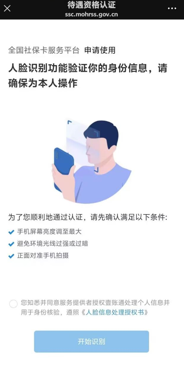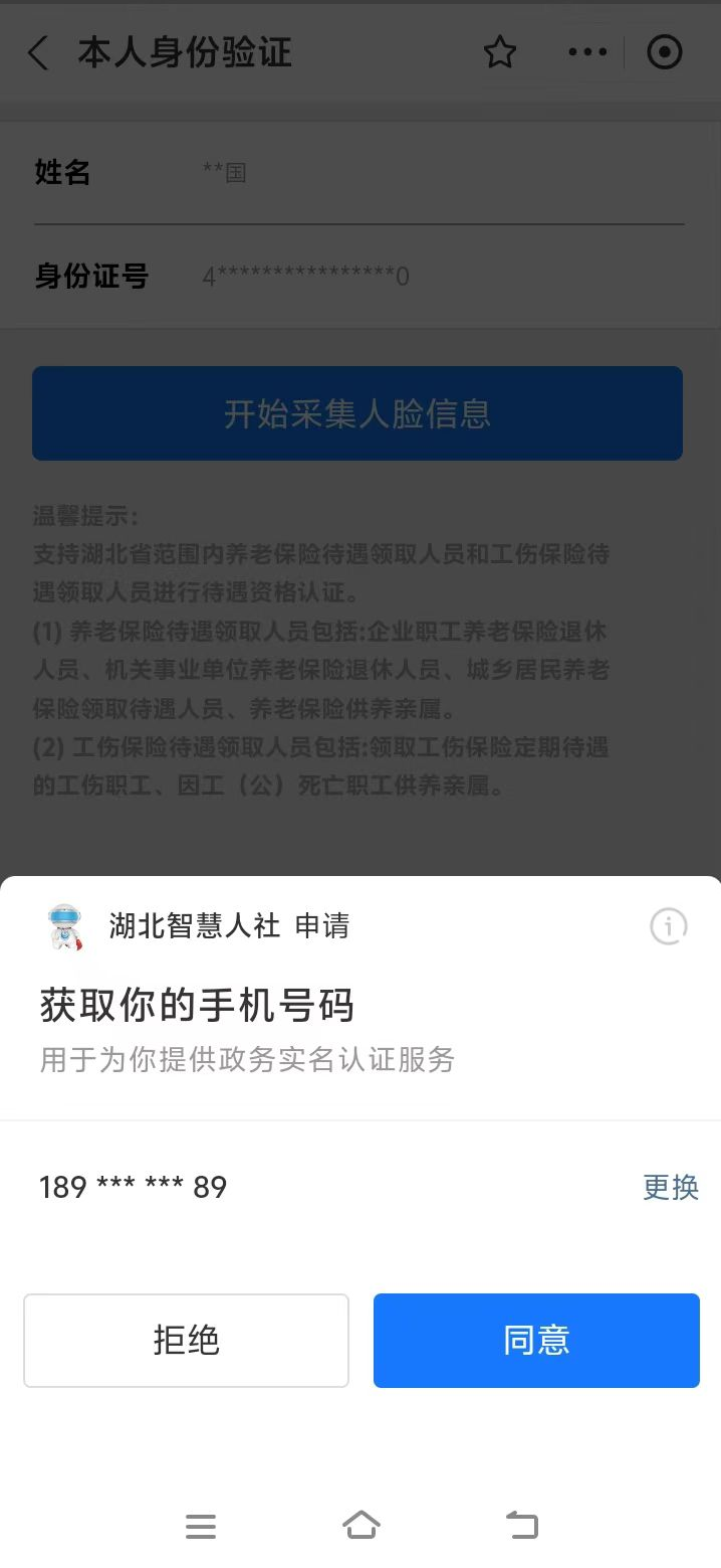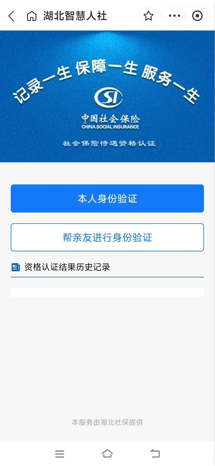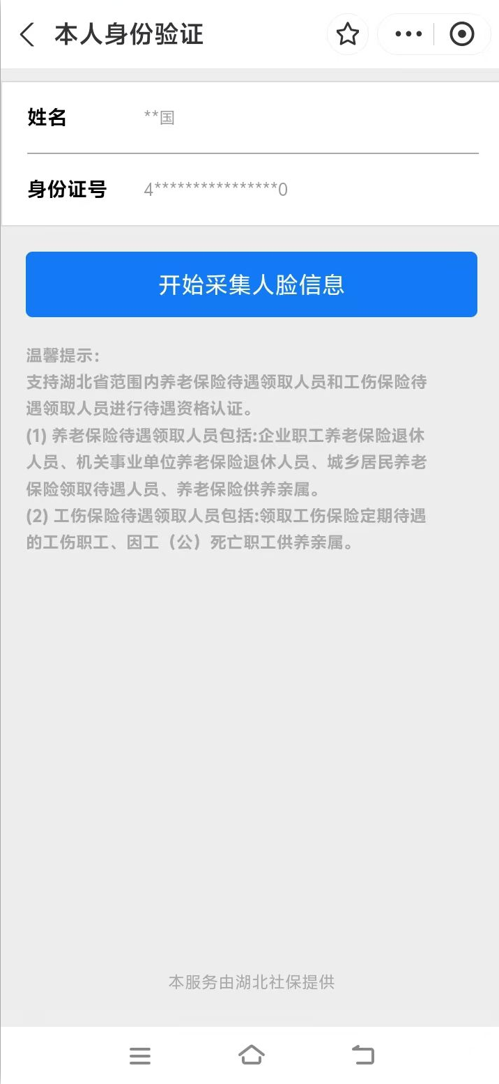 1.扫描上方二维码后,跳转进入湖北省智慧人社界面,点击“本人身份验证”或者“帮亲友进行身份验证”,填入“姓名”、“身份证号”,点击“开始采集人脸信息”即可开始资格认证。