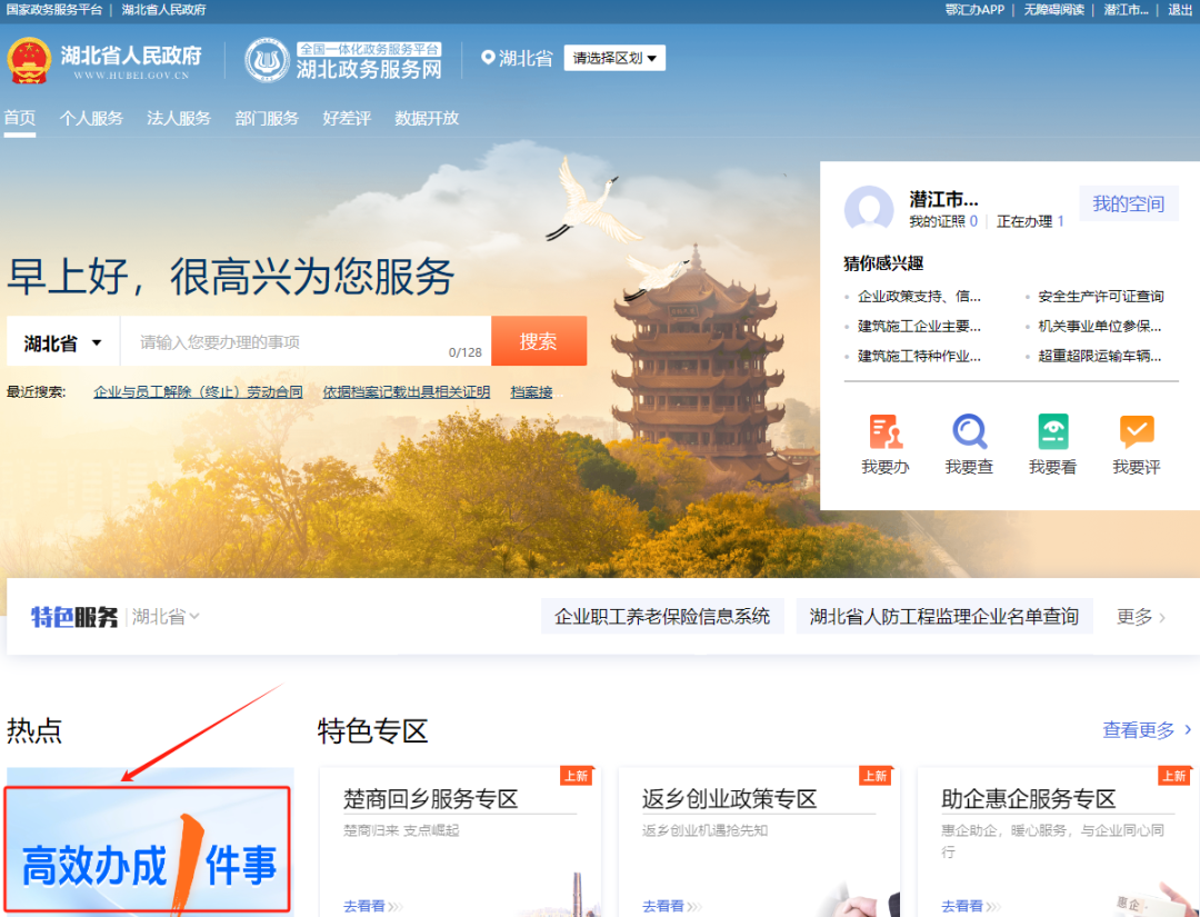 2.进入湖北政务网首页,点击“高效办成一件事”。