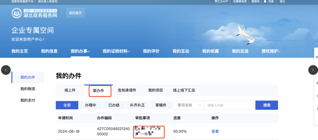 11.申报成功后,可随时查看办件的进度:首页点击“我的空间”,进入企业专属空间,点击我的办事(我的办件),选择联办件,点击“查看”,即可查看各个联办事项的进度情况。
