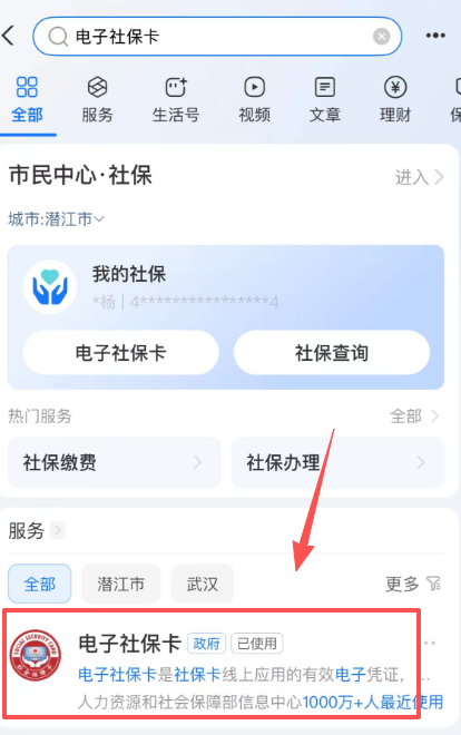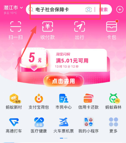 1.用支付宝扫一扫功能扫描下方二维码或在支付宝首页搜索栏搜索电子社保卡→进入支付宝电子社保卡小程序