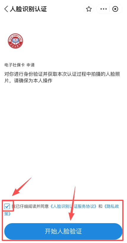 3、进入人脸识别认证环节,左下角同意说明打钩后点击“开始人脸验证”,人脸验证成功后即成功领取电子社保卡