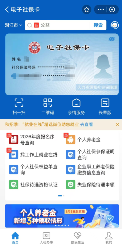 1.用微信扫一扫功能扫描下方二维码或在微信首页搜索栏搜索电子社保卡→进入微信电子社保卡小程序