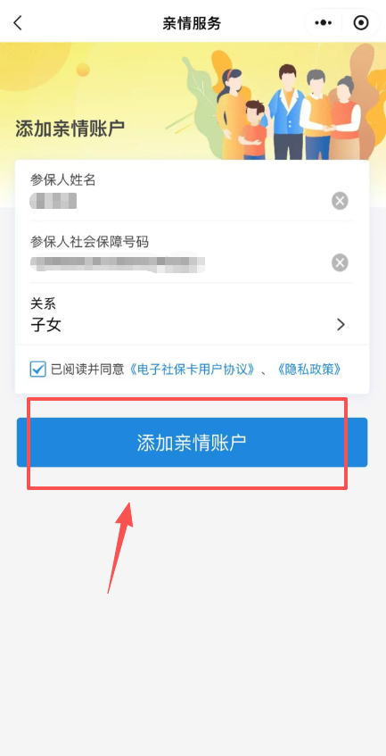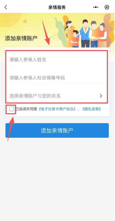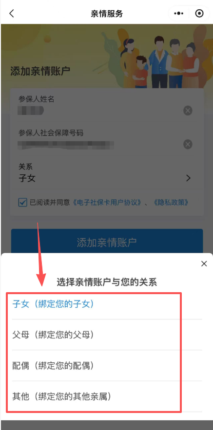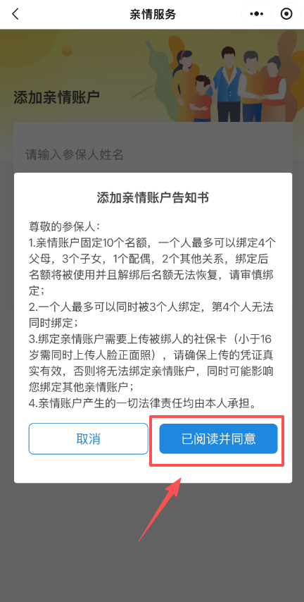 3、点击已阅读并同意,输入被绑定亲属的姓名、社会保障号码(身份证号码),选择被绑定人与自己的关系,勾选已阅读并同意