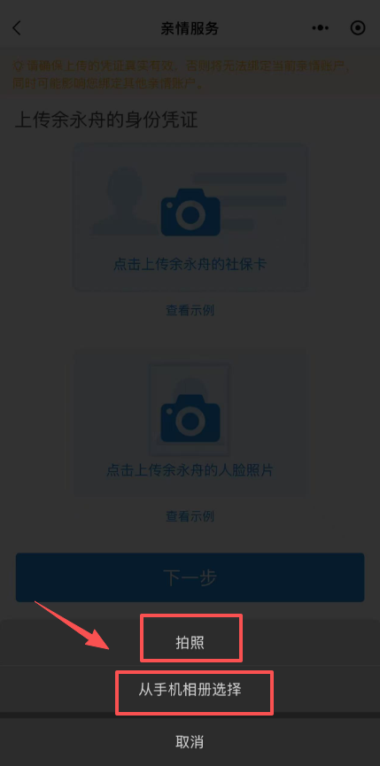 4、点击添加亲情账户→分别上传被绑定人的社保卡正面照片和人脸照片→上传照片时可选择现场拍照或从手机相册中选择已拍好的照片