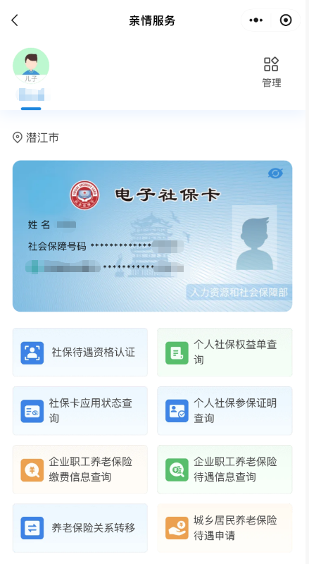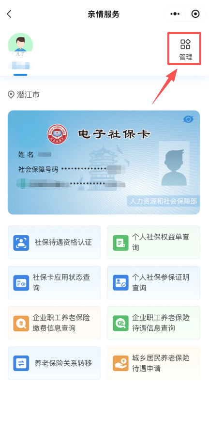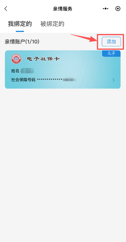 6、继续添加多名亲情账户,点击右上角管理→添加(重复上述操作即可继续添加电子社保卡亲情账户)