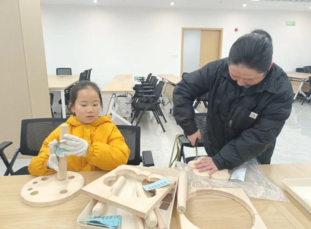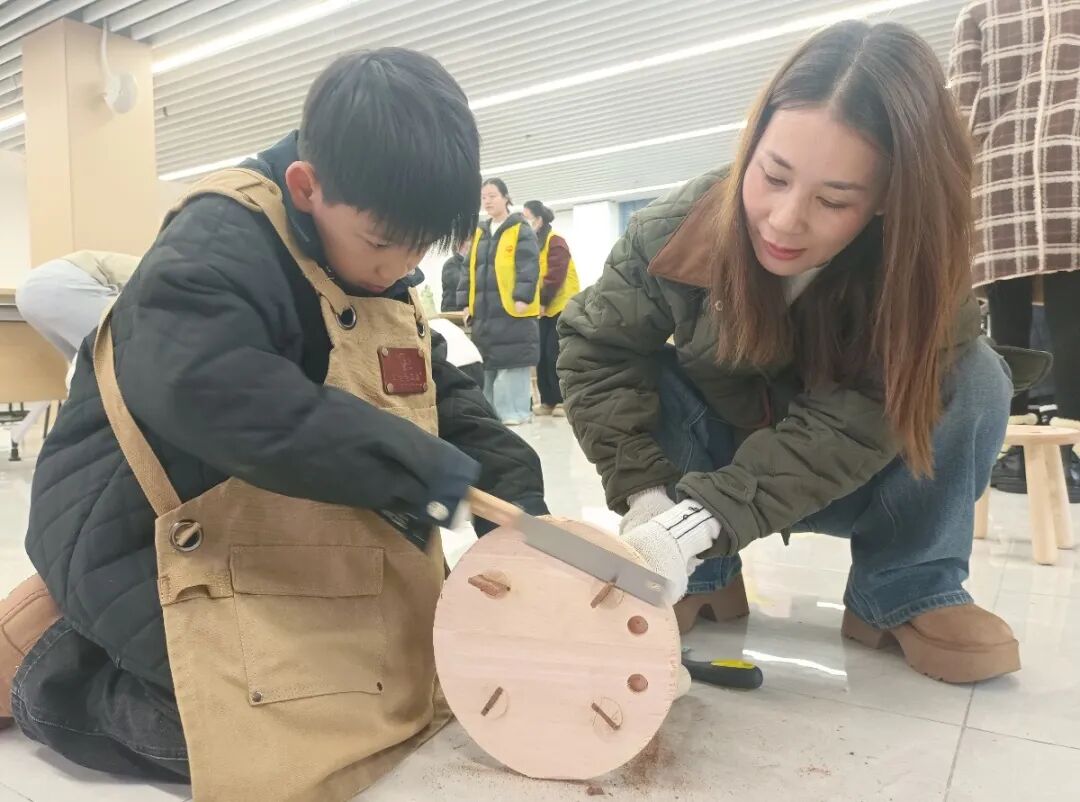 在木工DIY环节,亲子家庭共同制作花朵木凳,从锯木、打磨,到拼接、上蜡,家长和孩子分工协作,在木屑飞扬中,合作、耐心、专注、创造这些美好品质,在亲子协作中自然流淌,并融入一件有温度的作品里。