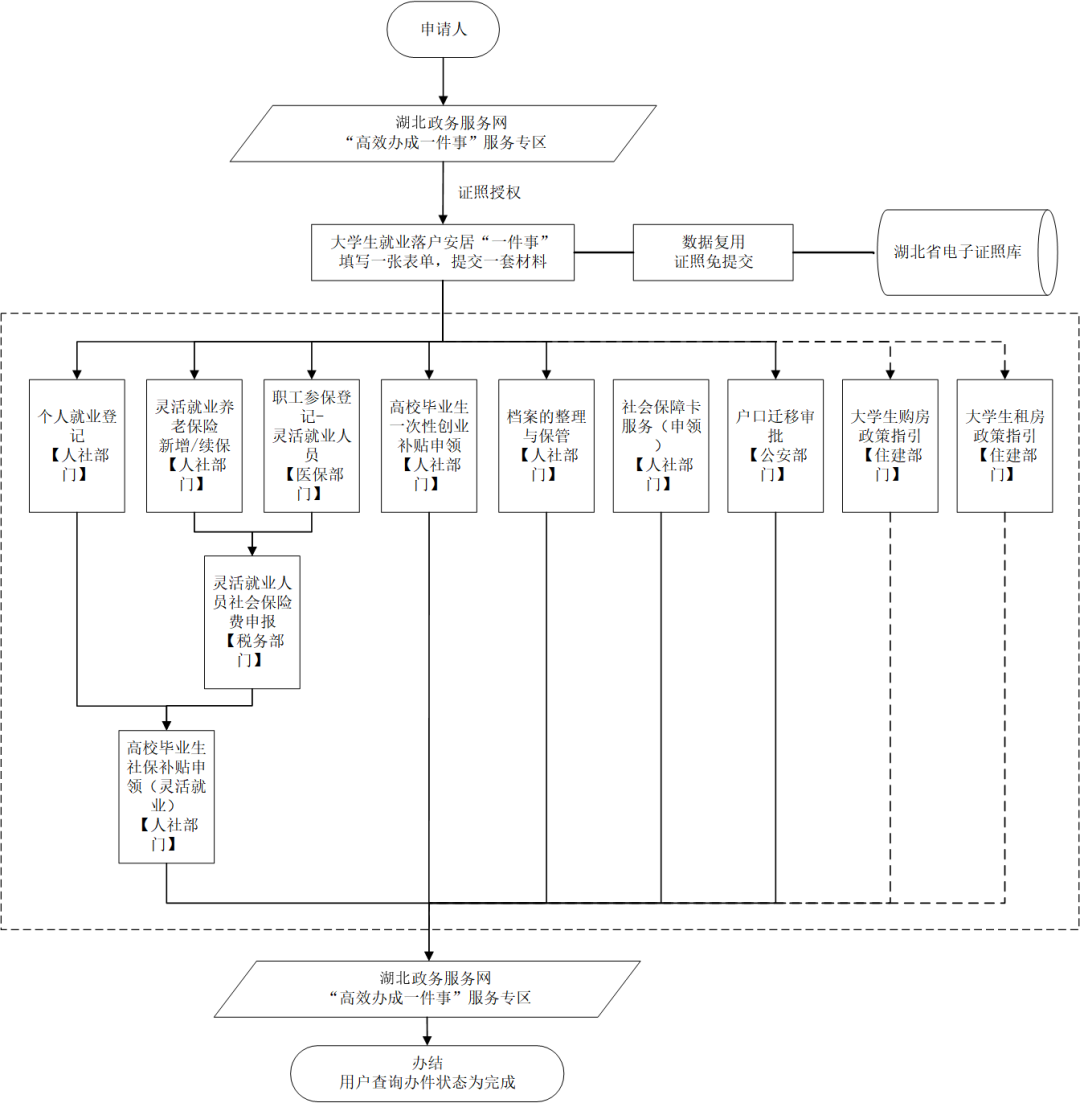 线上渠道:登录湖北政务服务网,进入“高效办成一件事”专区,找到大学生就业落户安居“一件事”,点击“在线办理”,提交所需材料即可。