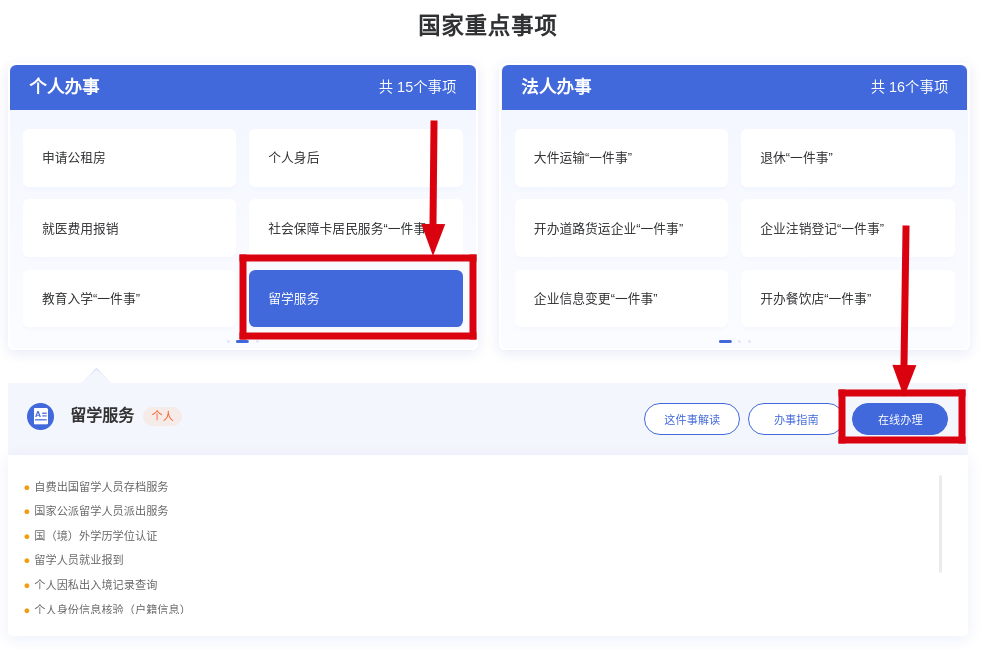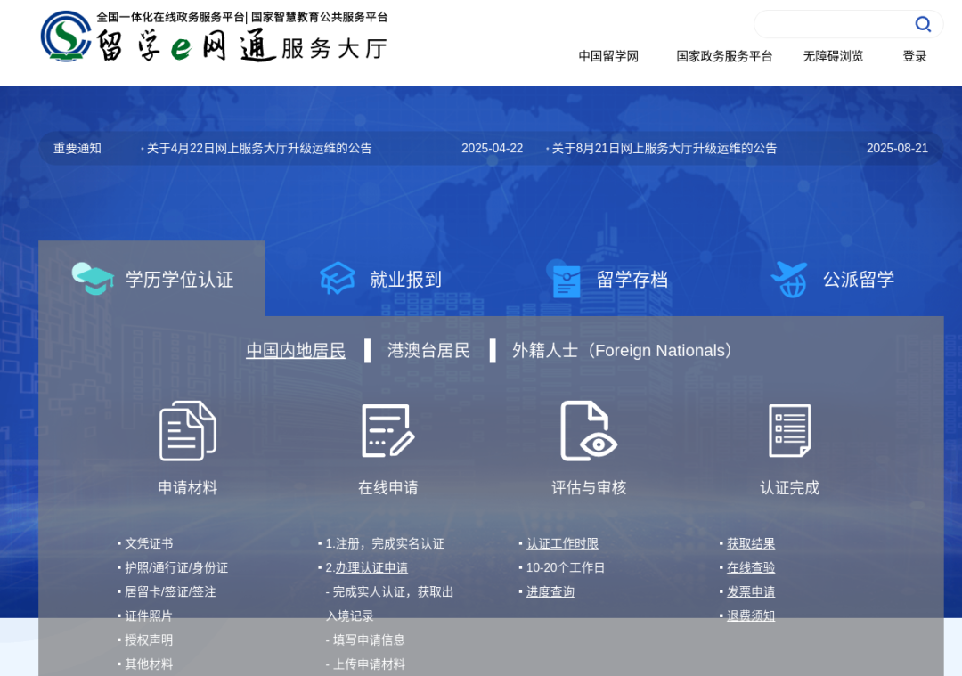 申报后页面跳转至“留学e网通服务大厅”,申办人根据自身需求选择具体办理事项,按照提示填写并上传相关信息和资料即可。