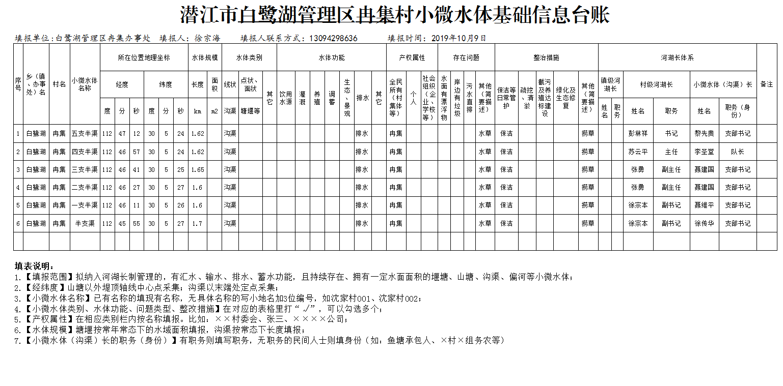 2.目标:2019年9月底前,完成小微水体摸排建挡;2019年底前,建成小微水体河湖长制体系;2020年底前,基本完成集镇区域小微水体整治,完成60%以上农村小微水体整治,建立以河湖长制为核心的长效管护机制;2021年底前,小微水体整治取得阶段性成效,基本实现小微水体“三无”(污水无直排、水面无漂浮物、岸坡无垃圾)目标。