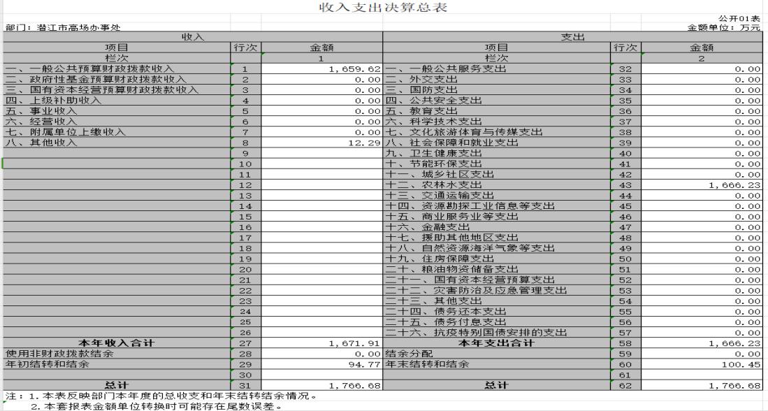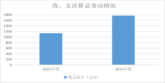 2022年度收、支总计均为1766.68 万元,其中:政府1516.22万元,财政250.46万元。与2021年度相比,收、支总计各增加632.08万元,增长55.7%,主要原因是发放2020-2022年在职退休人员奖励绩效。