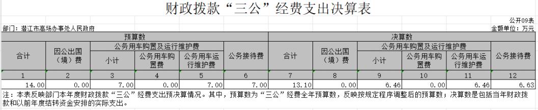 2.公务用车购置及运行费预算为7万元,支出决算为6.46 万元;其中:公务用车购置费0万元,公务用车运行费6.46万元,主要原因是根据潜江市公车改革要求,本单位公车是公务应急保障车辆,截至目前公务用车保有量为1。