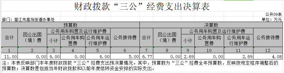 2023年度“三公”经费财政拨款支出全年预算为11.00万元(政府9万元,财政2万元),支出决算为6.77万元(政府5.06万元,财政1.71万元),完成全年预算的61.55%。较上年减少 9.1万元,下降 57.34%。决算数小于全年预算数的主要原因:根据要求,大力压减一般性支出,严格控制“三公”经费支出。