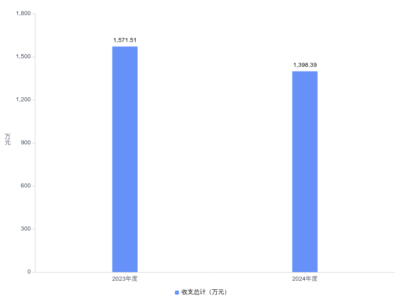 2024年度收、支总计均为1398.39万元,与2023年度相比,收、支总计减少173.12万元,下降11.0%。其中政府1222.52万元,与上年相比减少106.62万元,下降8.0%;财政175.86万元,与上年相比减少66.51万元,下降27.4%。